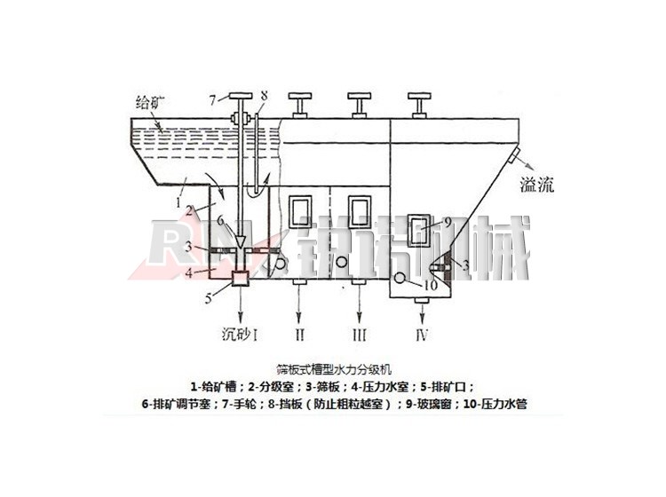 江西銳諾篩板式槽型水力分級(jí)箱又稱丹佛型水力分級(jí)箱,是利用篩板造成干涉沉降條件的設(shè)備,機(jī)體外形為一角錐形箱,箱內(nèi)用垂直隔板分成4-8個(gè)分級(jí)室。每個(gè)室的斷面積為200×200mm,在距室底一定高度處設(shè)置篩板。篩板上鉆有 36-72個(gè)直徑為3-5mm的篩孔。壓力水由篩板下方給入,經(jīng)篩孔向上流動(dòng)。在篩板上方懸浮著礦粒群,進(jìn)行干涉沉降分層。粗顆粒通過(guò)篩板中心孔排出,排出量用錐形塞控制。